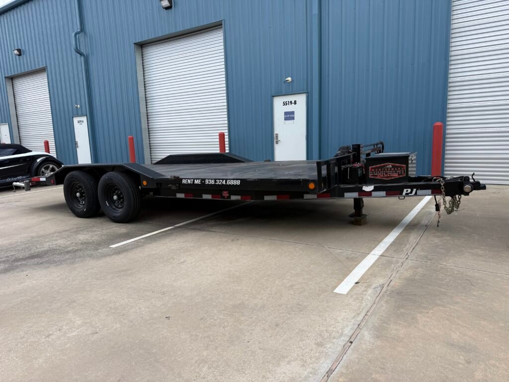 This PJ trailer features a 20 ft deck length with an 8.5 ft width, offering ample space for equipment and materials. It includes drive-over fenders for added versatility, a 14,000-lb GVWR rating, and a 9,000-lb carrying capacity as noted by the client. Tandem axles provide improved stability and control, while the heavy-duty construction ensures long-lasting performance under tough working conditions.